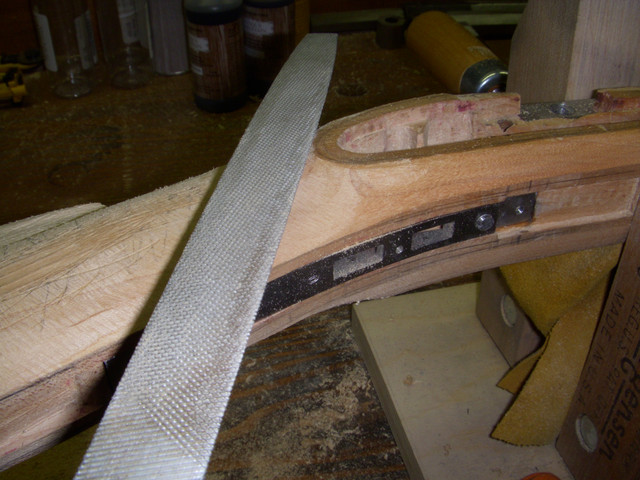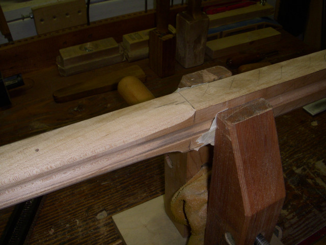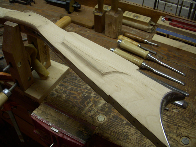 One of the things that I notice about longrifle contures is that there are few true radii, but many of the curves seem to be segments of ellipses. An ellipse is a curved line in which every point is equally the sum of the distances from two points. The common method for schoolboys and craftsmen to generate an ellipse is to drive to brads, make a loop of string to go around them and hang a pencil in the loop. By varying the length of the loop and the distance between the pins limitless variations may be produced. Fortunately for me, I have three different ellipse templates which handle most of my needs. The specific ellipse that I am using here is 1.750" from a 45 degree template (I honestly do not know what degrees have to do with describing ellipses). I think you can see that we skew the template to get a pleasing line that contacts the 1/16" radius and the bottom center point of the stock.