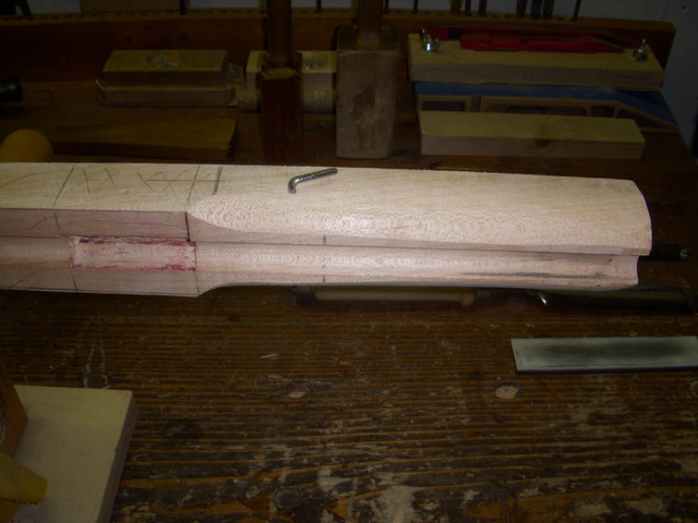 We start by laying out in the square what is already there. The dimensions were determined in our original plan. I took a short cut by tracing the octagon from a spare piece of barrel. Pretty obviously, our profile has to fit inside of this layout, but that still leaves room for lots of possibilities. A main resource for me is a group of 11 rifle drawings of southern rifles. These are Southern Originals 1 (5 prints), Southern Originals 2 (5 prints) and the Hershel House Foxfire Rifle (not an original, but I like it and it has seven cross sections). These are available from the Log Cabin Shop. I refer to them repetitively; it is nice to have one drawing, but with several you can compare different ways of doing the same feature. For chunk gun fans Originals 1 has a drawing of the best known old chunk gun, Old Scaley.