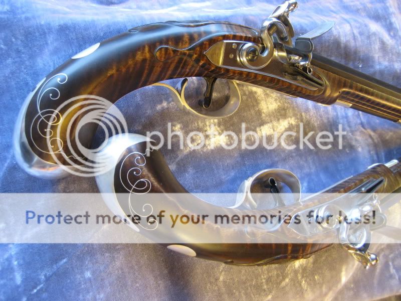 .055" wide ribbon is pretty scant to my way of thinking and doing things.  The wider the strip is the better hold the wood has on it.  Having a little stock to cut down at times is good too.  I think I usually shoot for somewhere in the range of .090" wide to start with.  I also try to raise burs as with the Gusler method of wire work.  Wider certainly makes things more difficult, especially on tight curves like these pistol grips.  Time will tell how well it hangs in there.  With all this said, your pistols look nice!