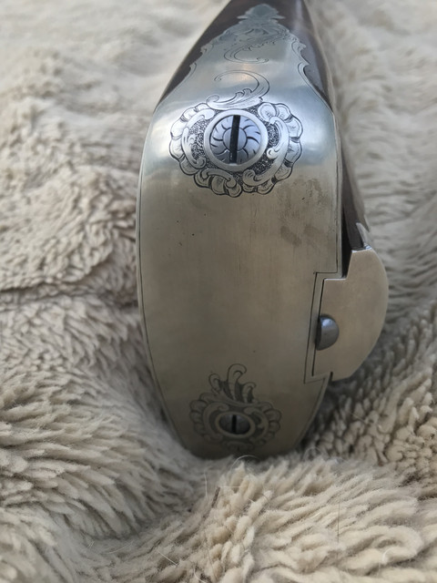 I guess I’m jumping on the Curtis and Dave English gun band wagon!  This is a Chambers English Sporting Rifle that Barbie tempted me with a couple years ago..., thanks Barbie!  It was especially tempting since she had the silver butt piece, guard, and side plate.  At any rate, I’ve been working on it here and there for the last several months, and here are the results.  It’s probably a little more decorative than most English Sporting Rifles, so my apologies to the more “traditionalists”.  The ram rod pipes were fashioned from sheet silver.  The stock was finished with a combination of checkering oil and Alkanet Root varnish.  I also scrubbed the stock with rotten stone and paraffin oil to cut the gloss.  The barrel was heat blued.  I was going for an effect that I saw in a photo (included), which I didn’t quite achieve, but decided not to alter, or “fix”.  Anyway, here it is...   I’d be happy to answer any questions you might have, or comments.  Best,