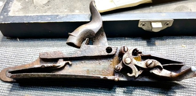 To Mikes comment regarding round vs flat faced locks:  There are examples of English flat faced locks dating to the second half of the 17th century.  The Henry Crips lock dated 1647 would be one example.  Granted, it is a dog lock but, going from memory - which can be a perilous move at my age - the plate bears some similarity to the plate on this piece.  What am I missing here?