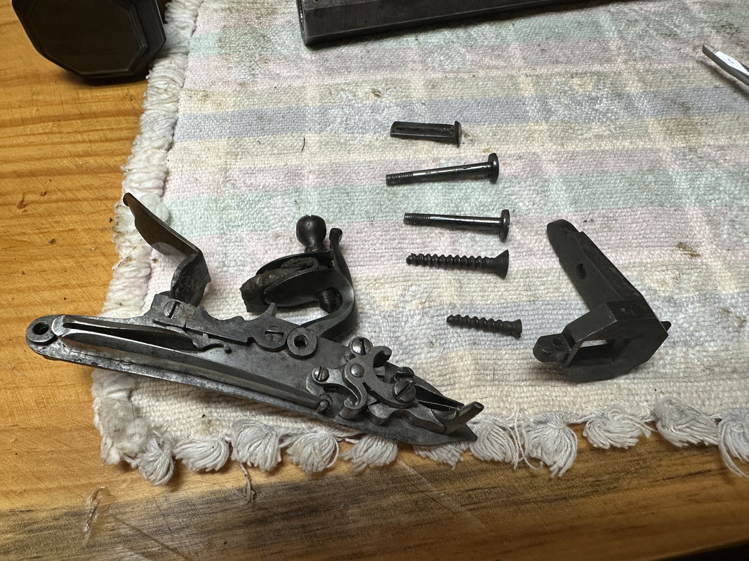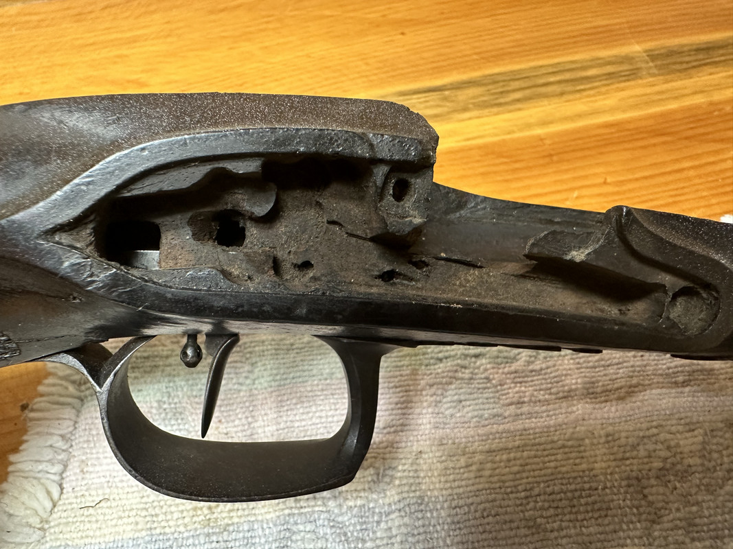 Barrel: Gorgeous swamp and rifling! Striping in some images looks like (faux?) Damascus. When you make the new breechplug, please don’t change the female threads in the barrel. Match the plug threads to the barrel. I agree the numbers look relatively recent. Maybe "bondo man" put his "mark" (last four of SSN) hidden under the barrel? If you know who owned it in the past, you might corroborate that.