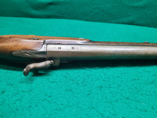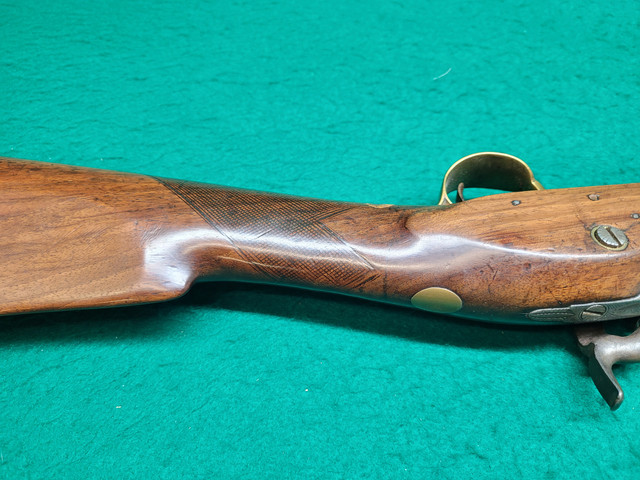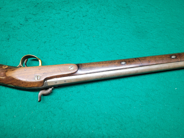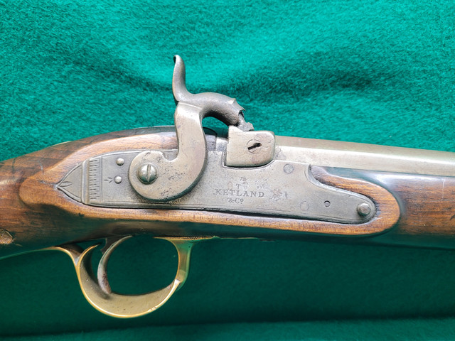 Those are post 1813 Birmingham proof marks on the barrel. The T. Ketland & Co. lock was originally flint and dates probably to the early 1800s. The brass mounts look to be from an inexpensive English export gun. I suspect the gun was restocked from older parts. The percussion conversion is rather poor because the hammer does not strike the nipple squarely. The hammer may be a later ill fitting replacement.